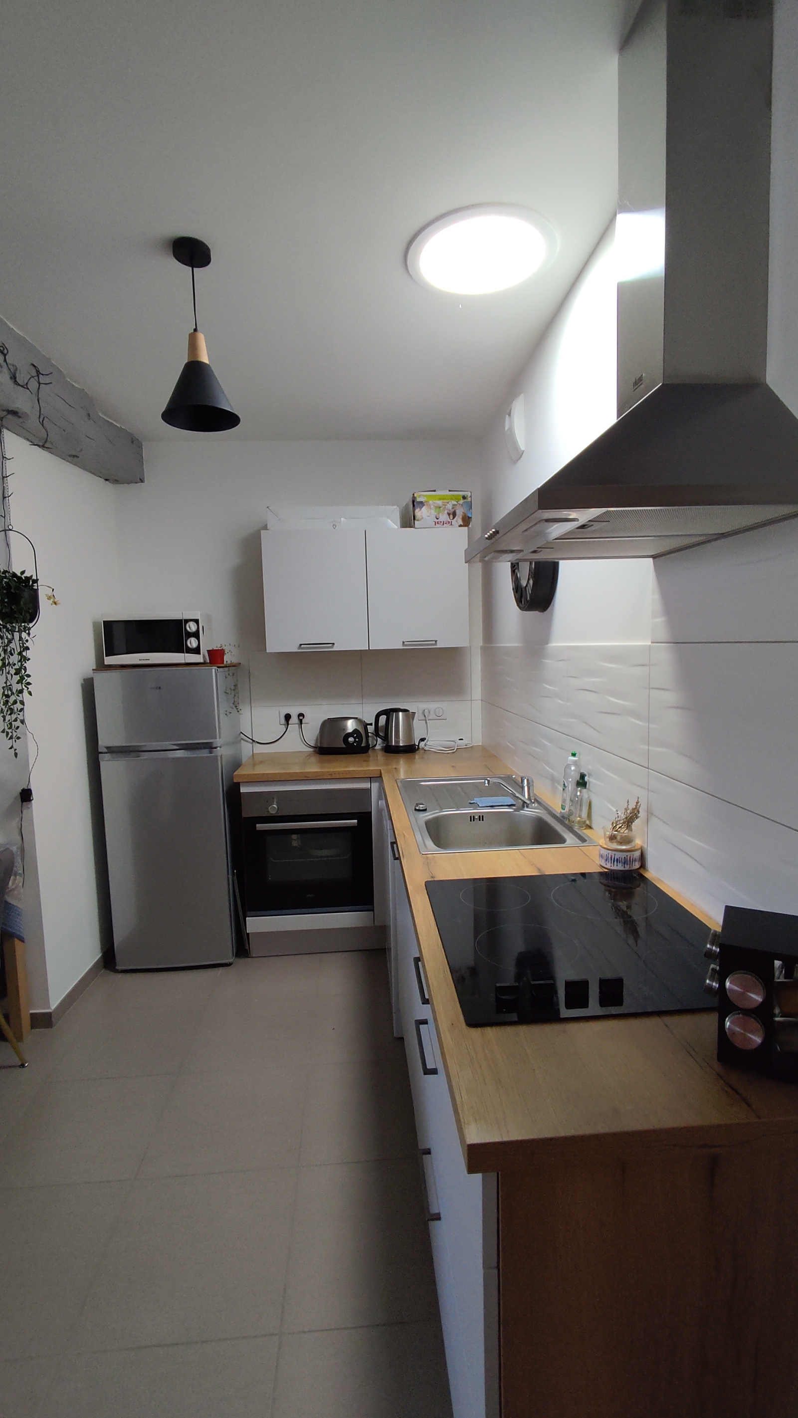 - Un séjour spacieux de plus de 25 m² avec une cuisine ouverte semi-équipée (incluant hotte, plaque de cuisson et four).